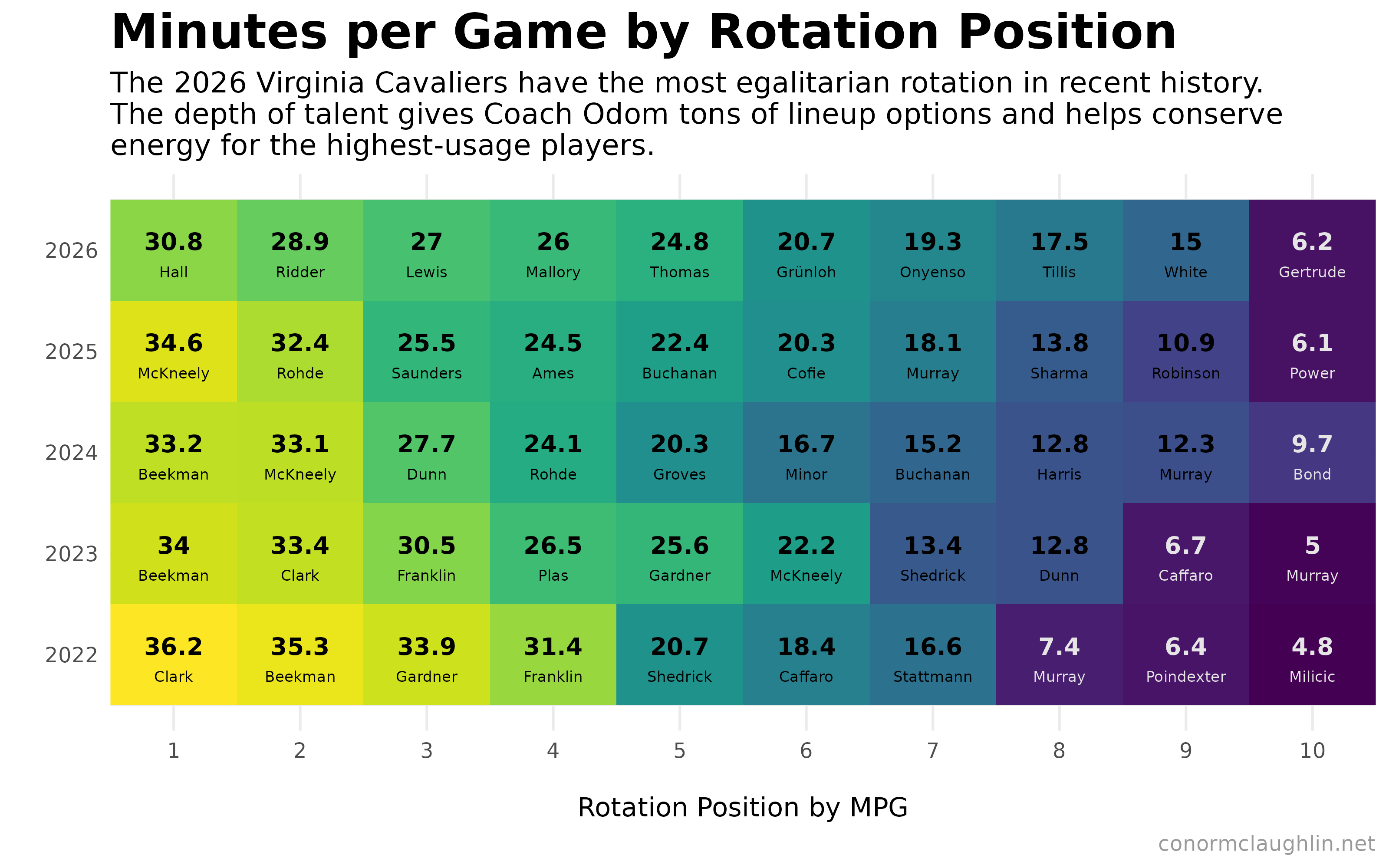 In December, I wrote a fun post identifying some of the (early) changes in Virginia’s playing style under new head coach Ryan Odom. At the time, the differences in pace of play and shot distribution really stood out, for good reason! But what I hadn’t yet caught onto were the differences in rotation, lineups, and substitution patterns… until the Georgia Tech game made that crystal clear.