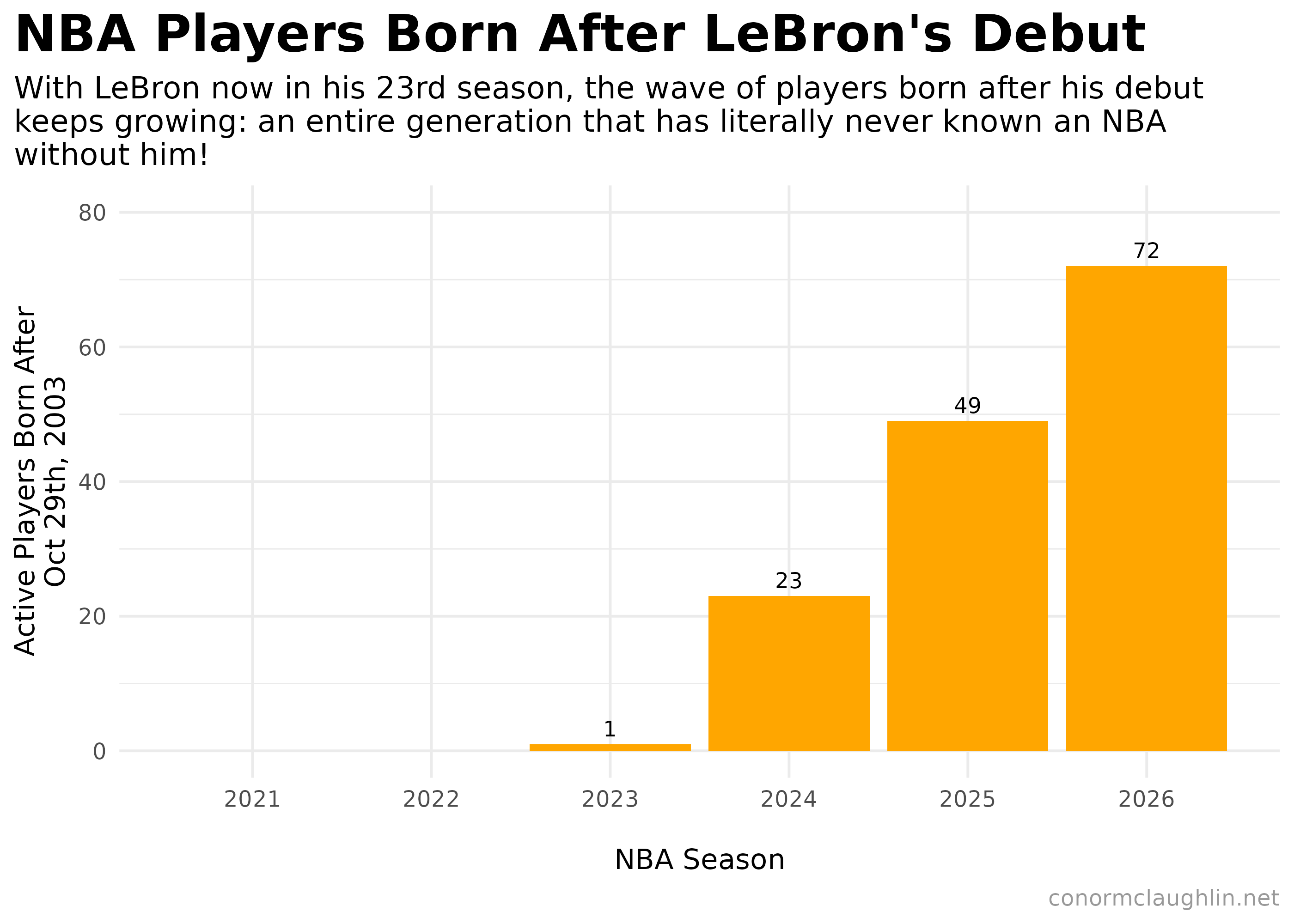 A week ago, LeBron made his season debut for the Lakers, posting an 11/3/12 line in 29 minutes against the Jazz. The outing was particularly notable because it marked the first time any NBA player has ever competed in their 23rd season - a remarkable feat of longevity.